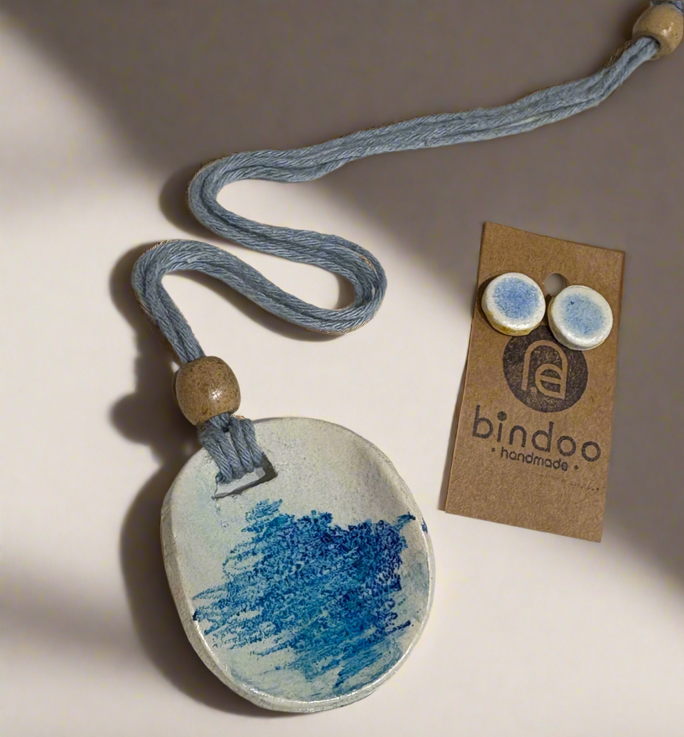 Introducing our Clay Blue and White Round Pendant with studs set, the perfect addition to your jewelry collection. This lightweight and minimalist pendant features a trendy and quirky style, making it versatile for any occasion. Step up your accessory game with this stylish and unique piece.