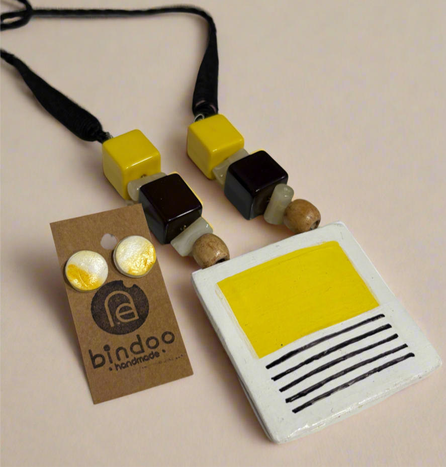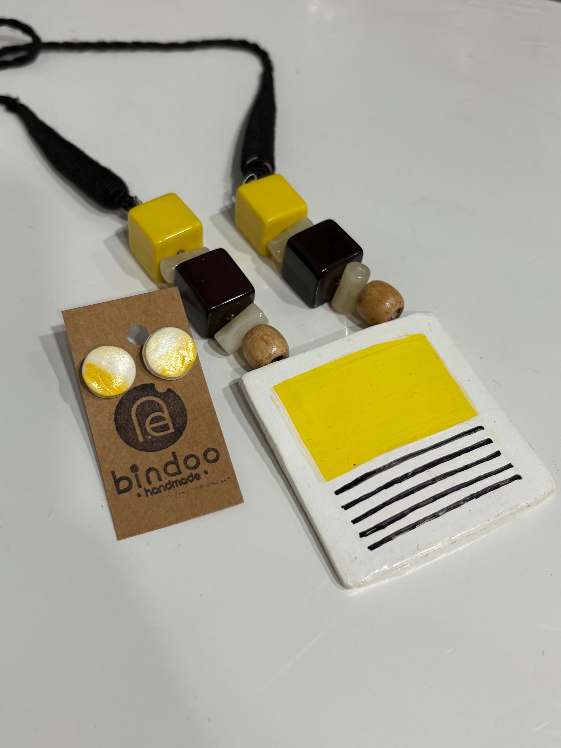 This handcrafted clay necklace set combines yellow, white, and black for a minimal, trendy design suitable for all occasions and perfect for western style. Elevate your look with this versatile and unique accessory.