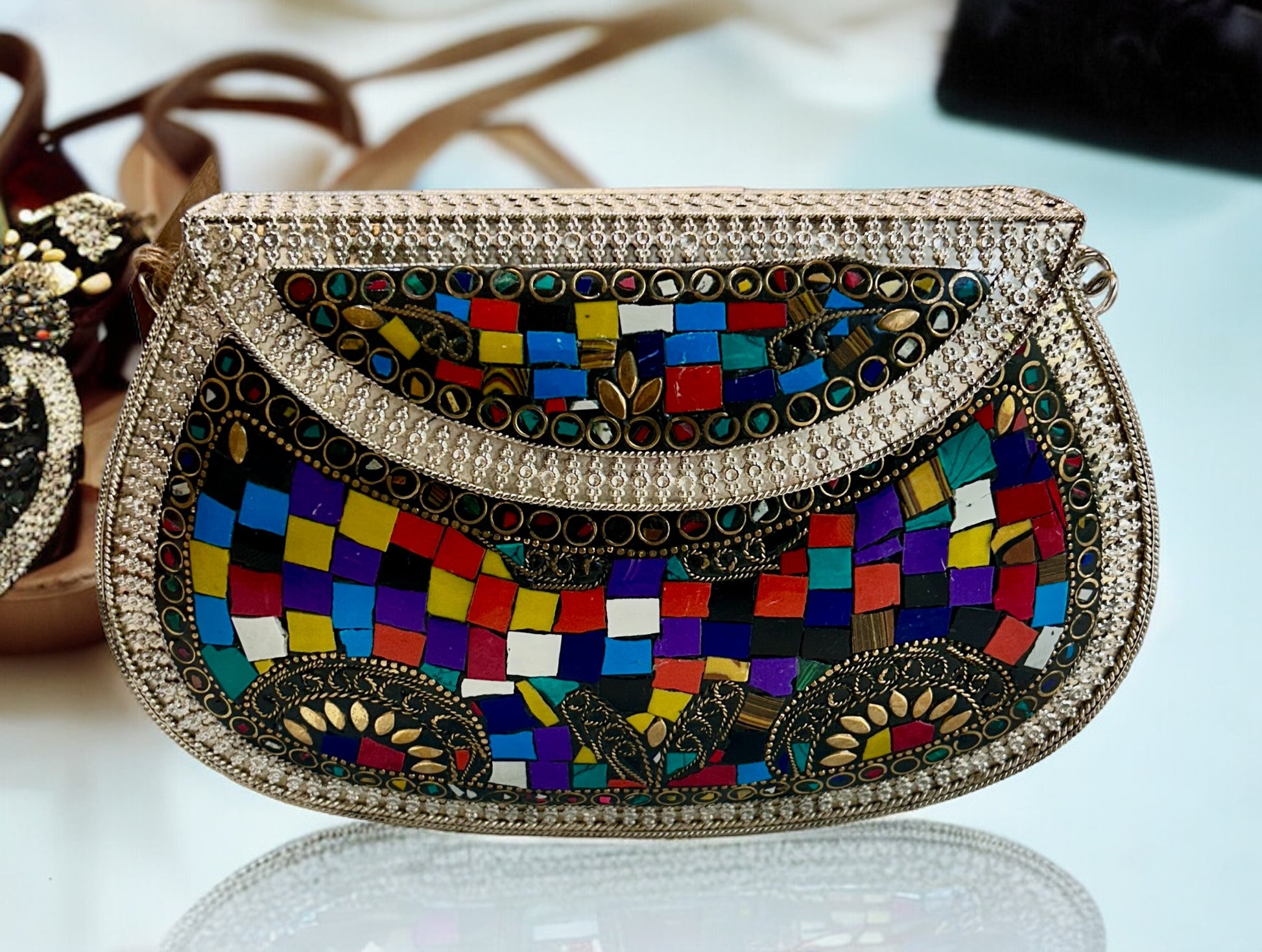 Indulge in luxury and sophistication with our Colourful Studded Stones Oxidized Metal Purse. Handcrafted with intricate stones and oxidized metal, this ethnic purse is a masterpiece that exudes elegance and exclusivity. Add a touch of art and culture to your ensemble with this unique piece.