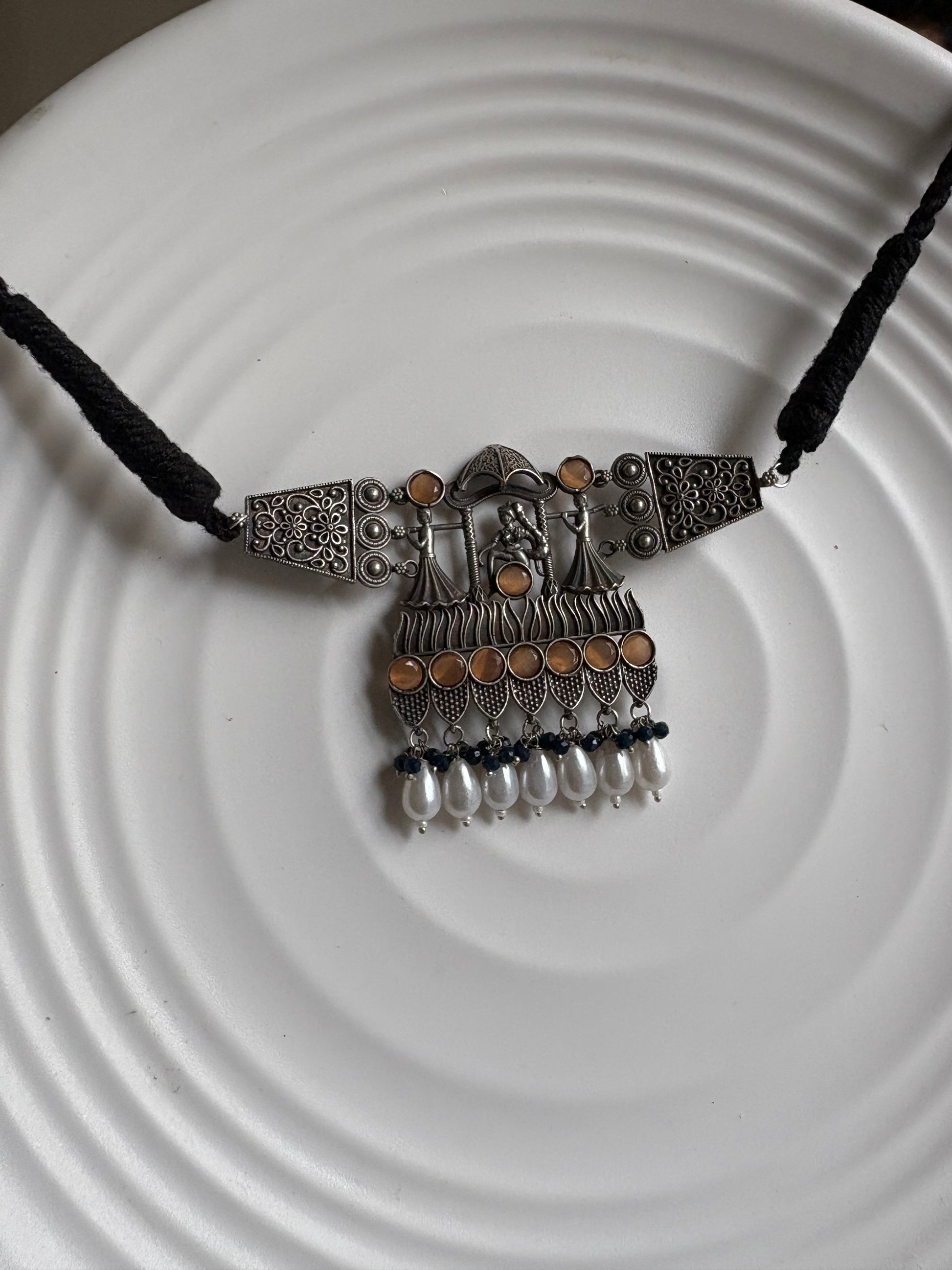 Indulge in the luxury of our Doli pendant choker with earrings. Its minimal design is both elegant and lightweight, making it the perfect accessory for any traditional occasion. Elevate your style with this exclusive piece that exudes sophistication and refinement.