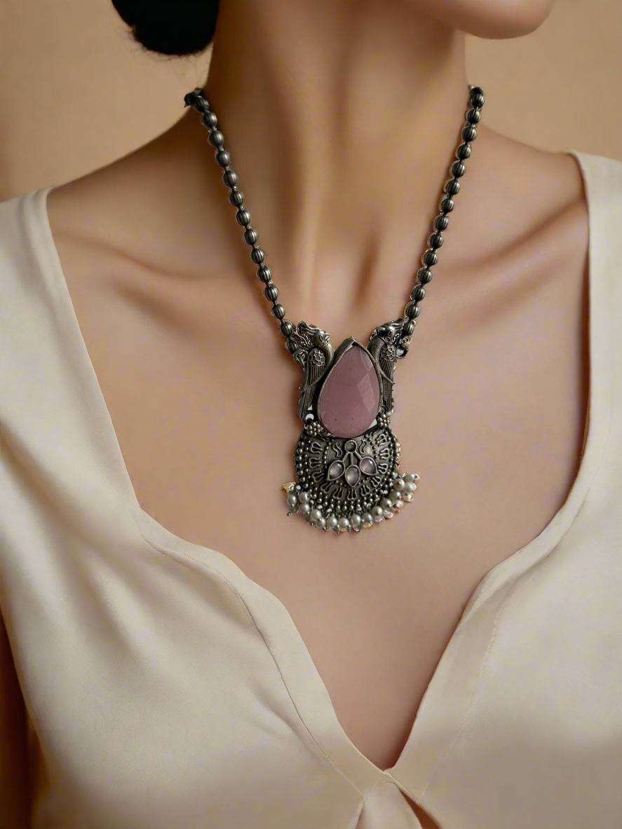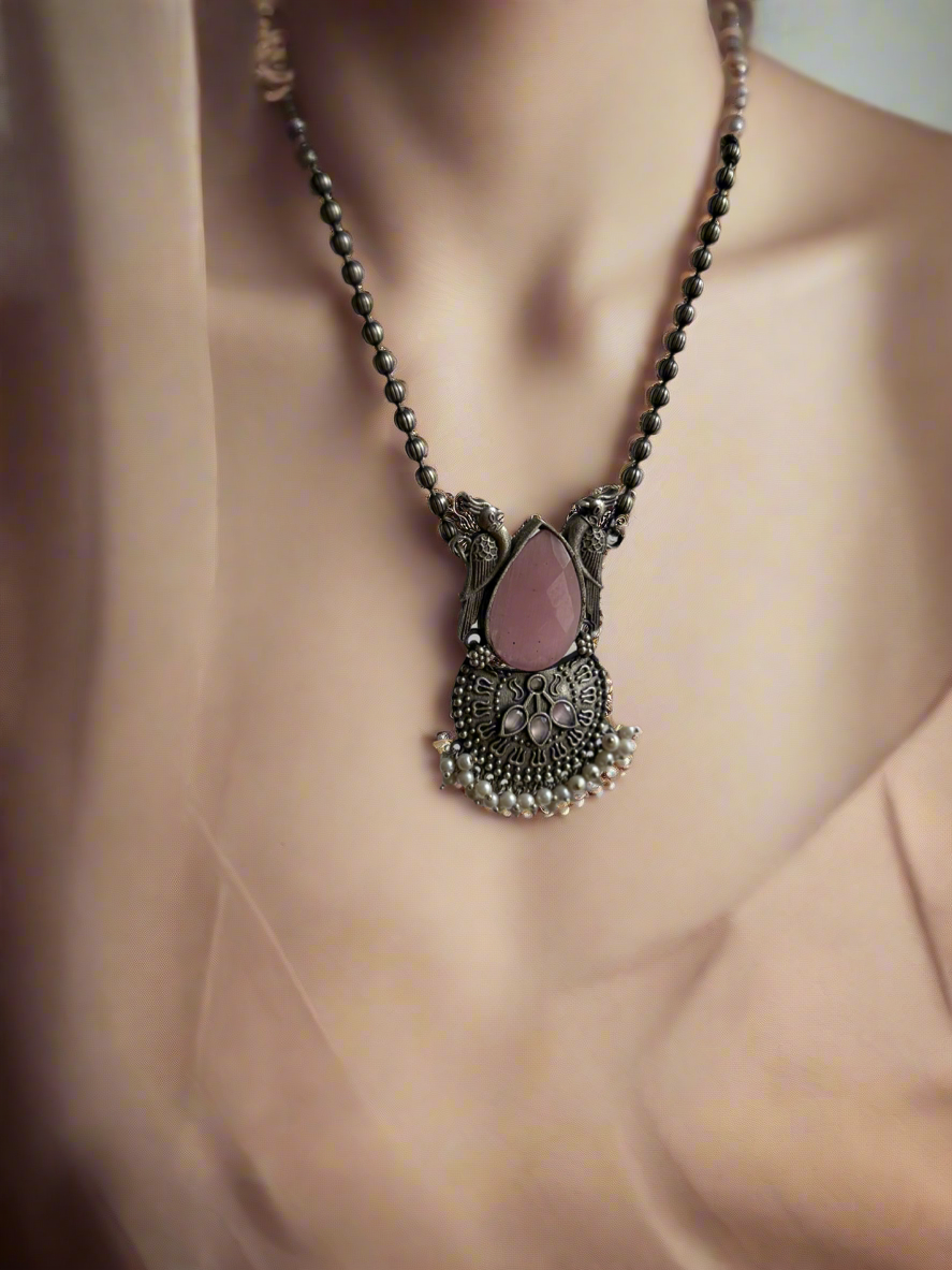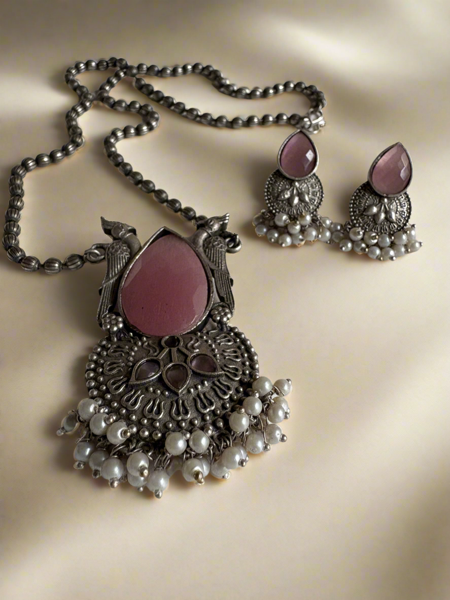Add a touch of elegance and style to your look with our Pink Crystal stone black polished necklace and earrings set. The stunning parrot design adds a unique element to this traditional wearable. The long chain pendant accentuates the minimal design, making it a must-have accessory. Elevate any outfit with this beautiful set!