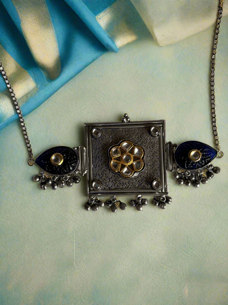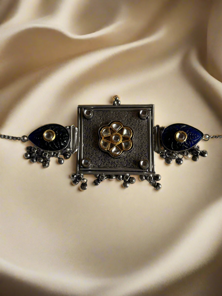 Add a touch of quirkiness to your outfit with this silver polished choker featuring unique minakari work. The minimal design makes it perfect for both Indian and Western outfits. Spice up your style without taking yourself too seriously with this playful accessory.