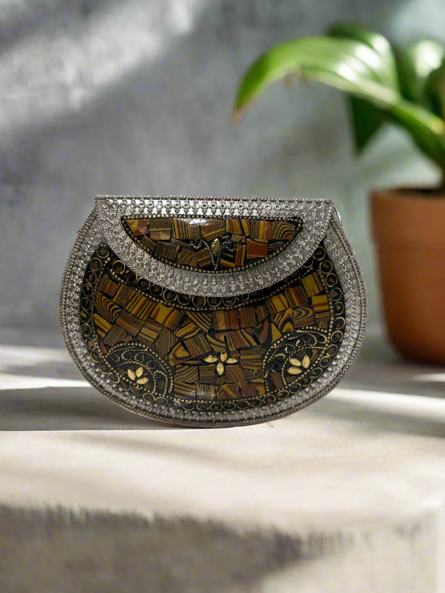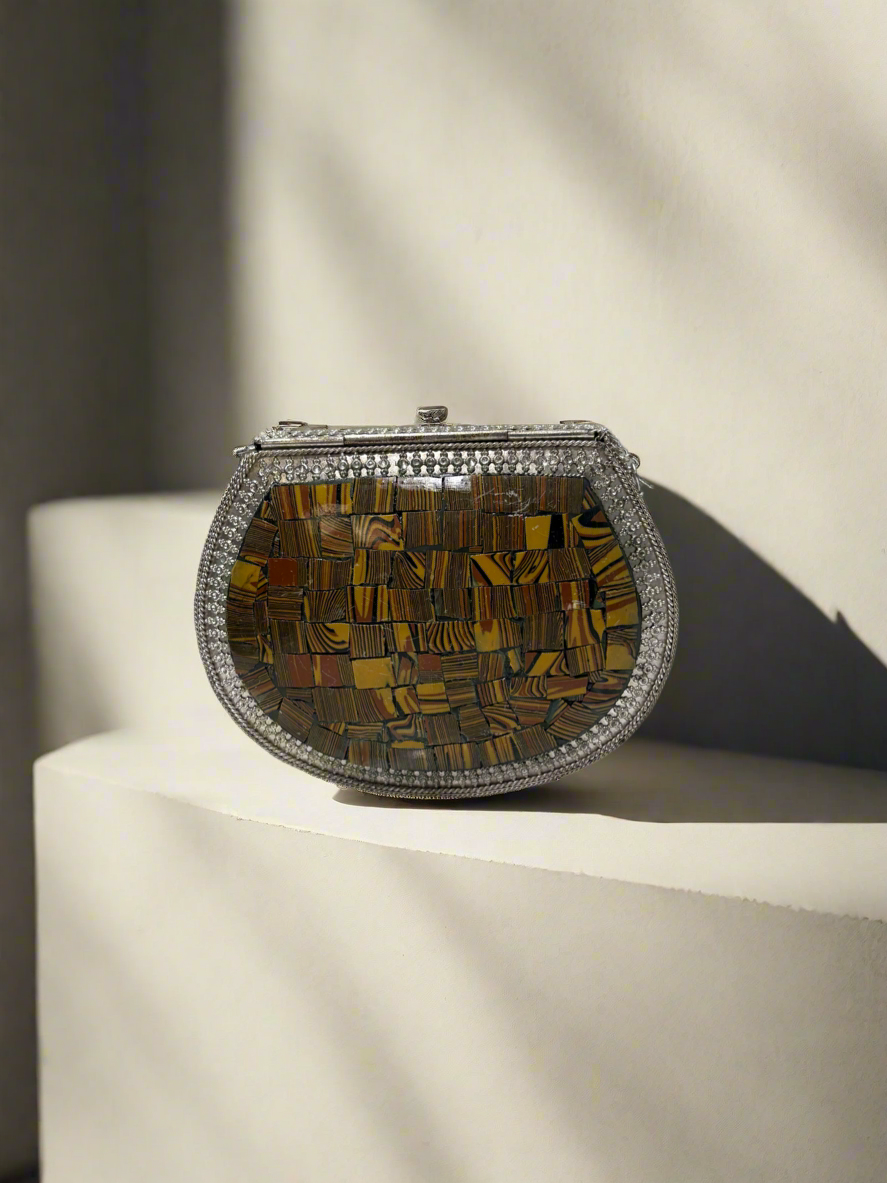 Get ready to elevate your style game with the Stone Metal mini handbag. Perfect for any occasion, this trendy and fancy bag is an effortless way to amp up any outfit. Whether you're headed to a party or the office, this bag is a must-have. Its compact size makes it easy to carry, and it's versatile enough to pair with both office wear and traditional attire. Gift it to a loved one or treat yourself to this stylish piece.