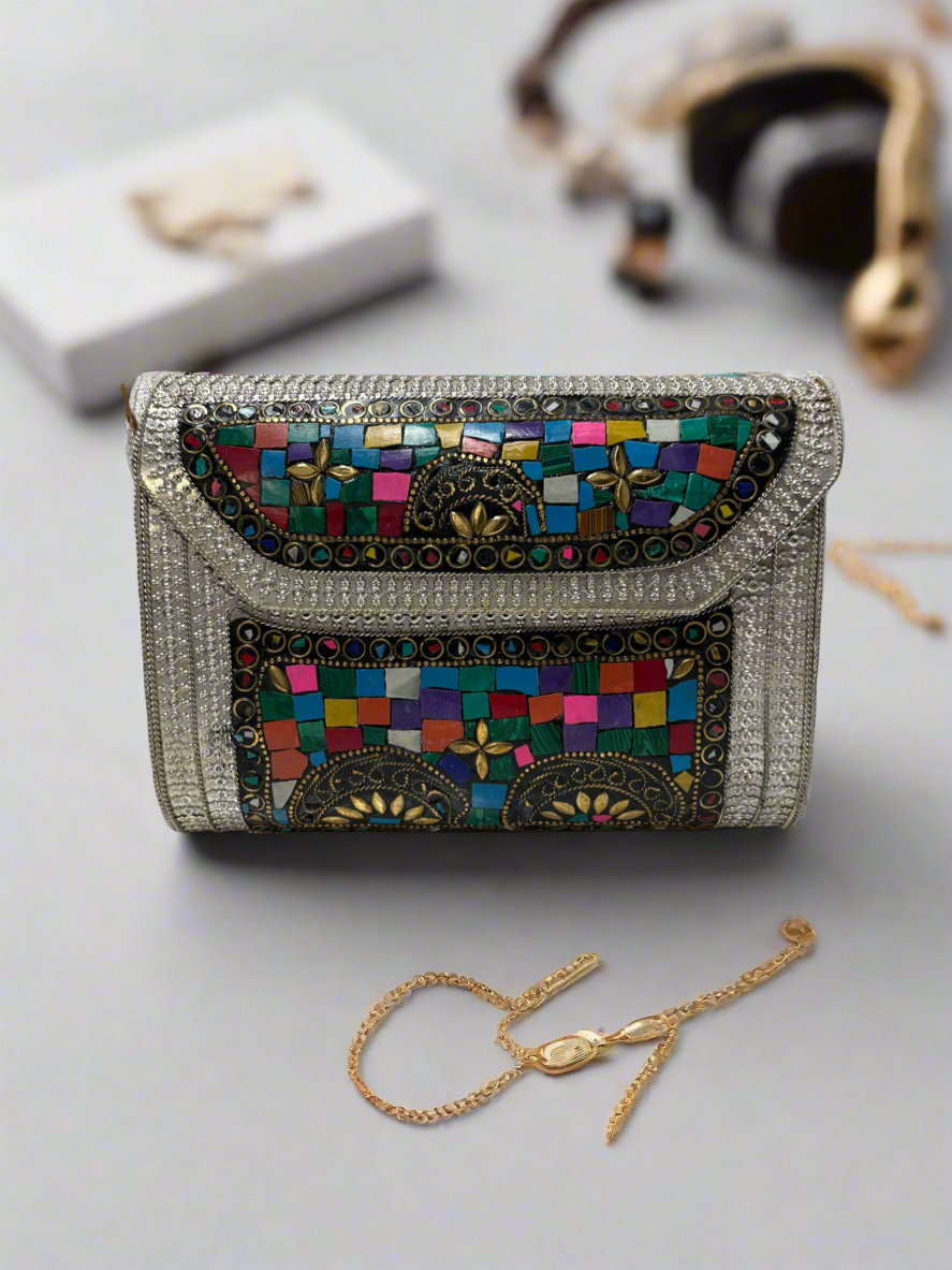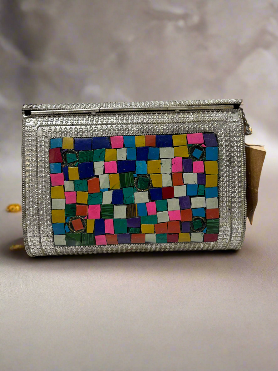 Colourful Studded Stones Oxidized Rectangular Metal Purse