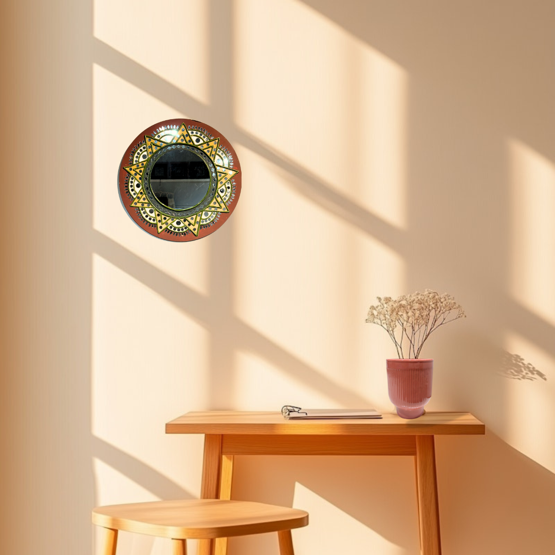 This handmade lippan art mirror is perfect for adding a touch of elegance to any living room, bedroom, or terrace. With its minimal and contemporary design, it will complement any decor. The mirror work adds a handmade touch, making it a unique and stylish addition to your home.