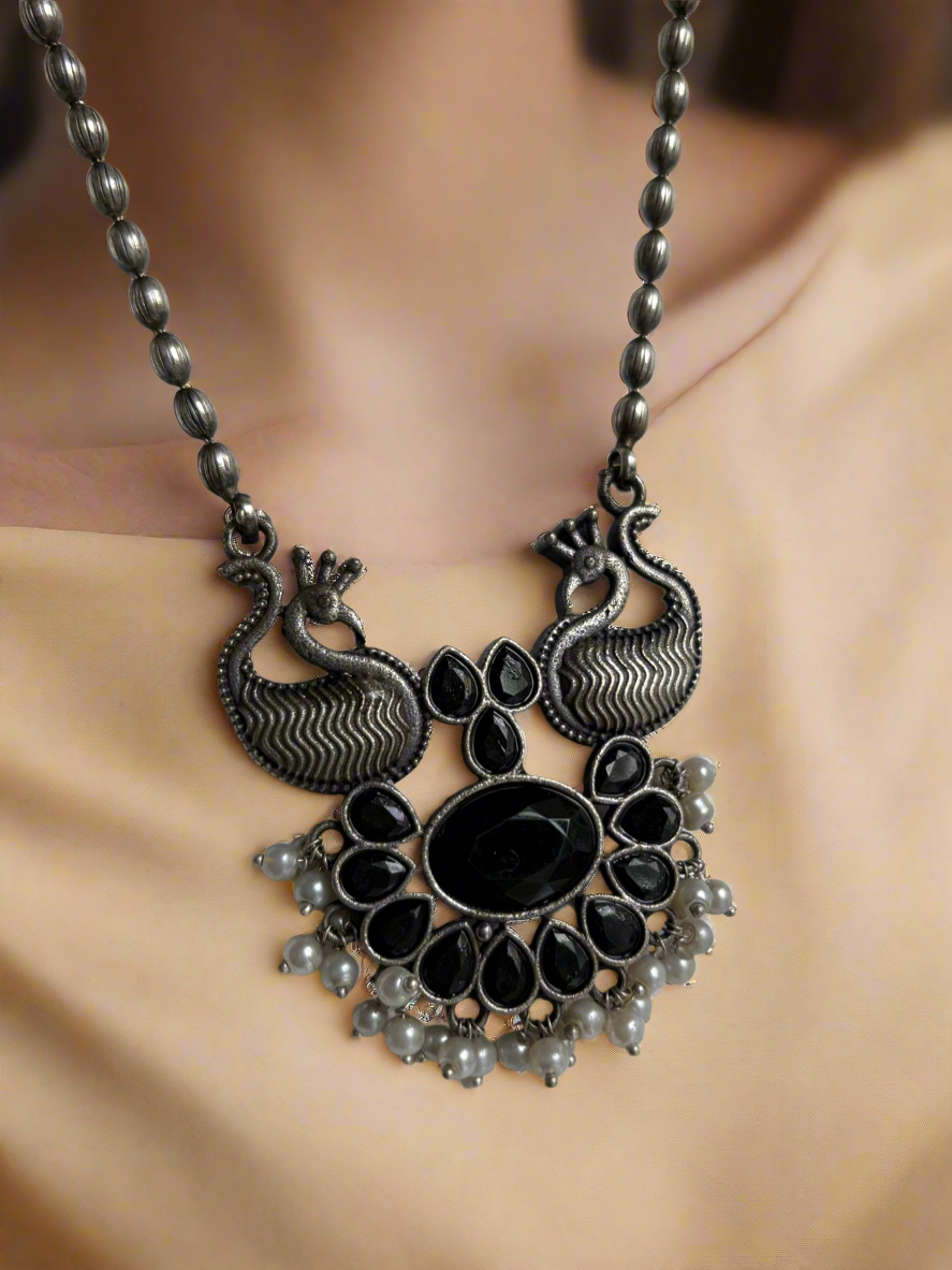 Add a touch of minimalistic elegance to your outfit with our silver plated black stone pendant chain necklace. This lightweight and traditional design is perfect for any occasion, adding a touch of indo-western flair to your look. Make a statement with this long necklace and elevate any outfit.
