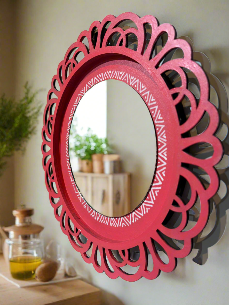 Check yourself out in this quirky pink wall mirror! Handcrafted and handpainted, its unique carved design adds a touch of contemporary style to any room. Get ready to be the envy of all your friends with this playful and fun addition to your home decor!