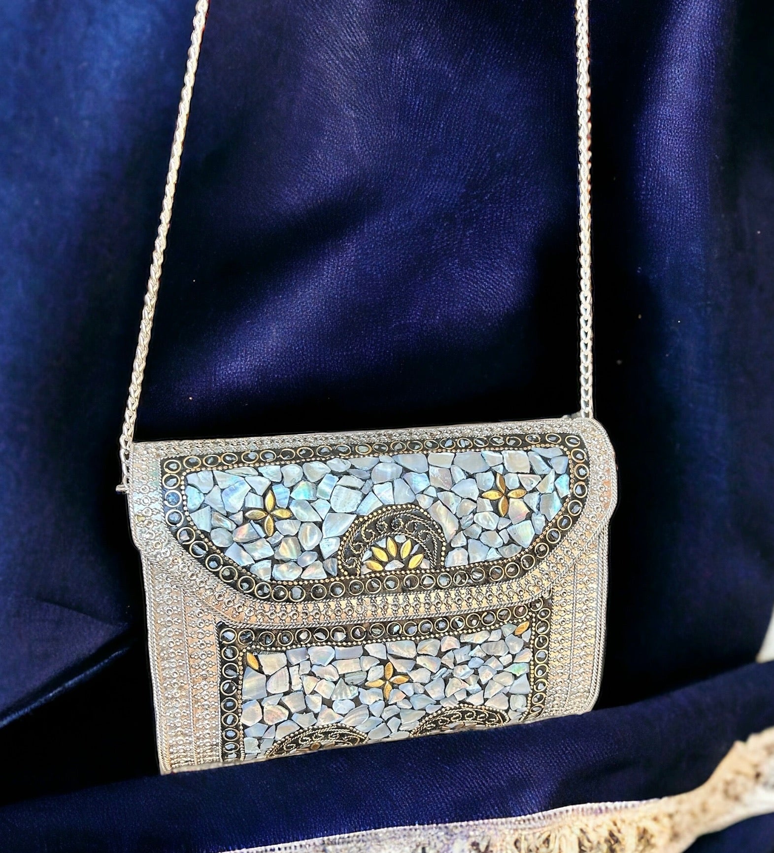 This studded stones oxidized metal purse is a handcrafted ethnic piece that exudes elegance and sophistication. The intricate metal detailing and stone embellishments make it a unique and exclusive accessory. Carry your essentials in style with this luxurious purse.